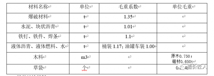 有容器或包裝的材料及長大輕浮材料,應按規(guī)定的毛重計算。桶裝瀝青、汽油、柴油按每噸攤銷一個舊汽油桶計算包裝費(不計回收)。