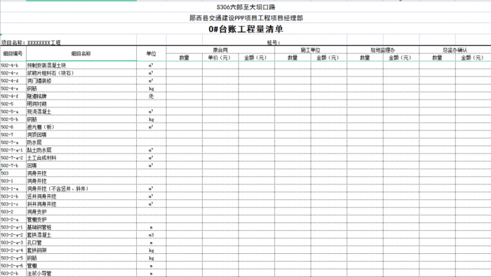“0#”臺(tái)賬按單位、分部、分項(xiàng)工程劃分標(biāo)準(zhǔn)編制,可以將計(jì)量支付與質(zhì)量檢驗(yàn)評(píng)定有機(jī)結(jié)合起來,這樣可以使質(zhì)檢、測(cè)量、實(shí)驗(yàn)、計(jì)量等部門的內(nèi)業(yè)工作都在同一個(gè)規(guī)則下進(jìn)行,提高了整個(gè)項(xiàng)目(合同段)內(nèi)業(yè)管理的效率。